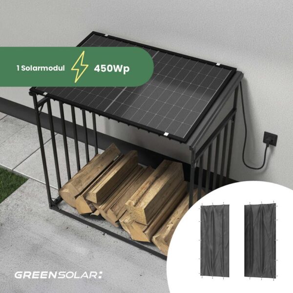 Kaminholzregal mit Balkonkraftwerk 450 Wp inkl. Plane